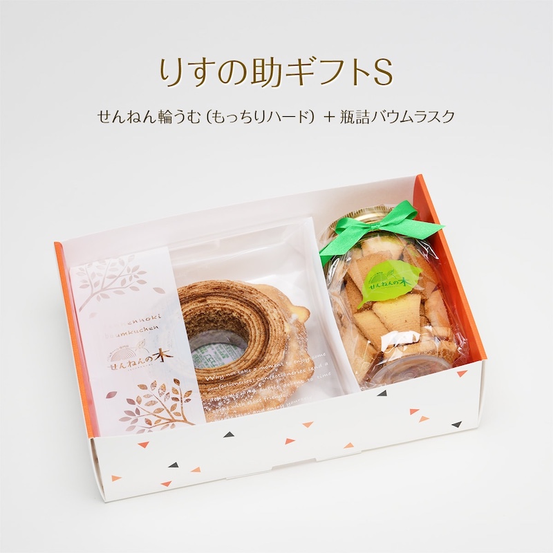 せんねん輪うむ(もっちりハード)+瓶詰めバウムラスクのギフトセット。瓶入りのかわいらしいパッケージでギフトにぴったりです。
